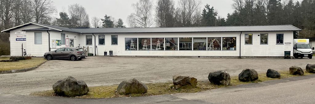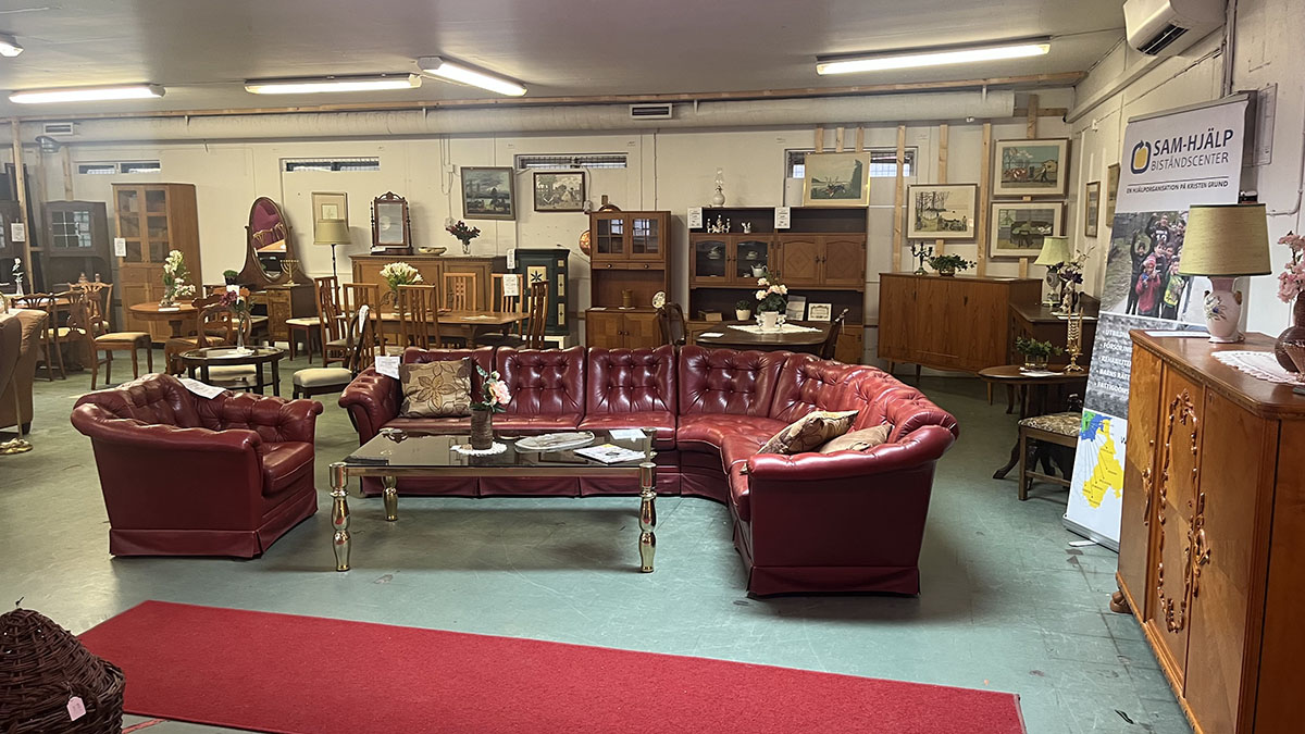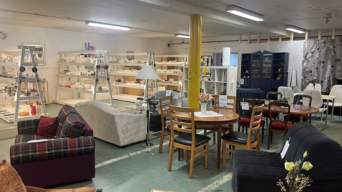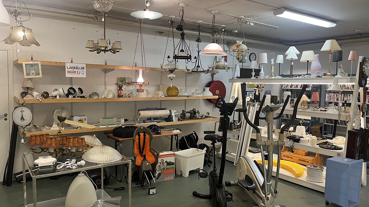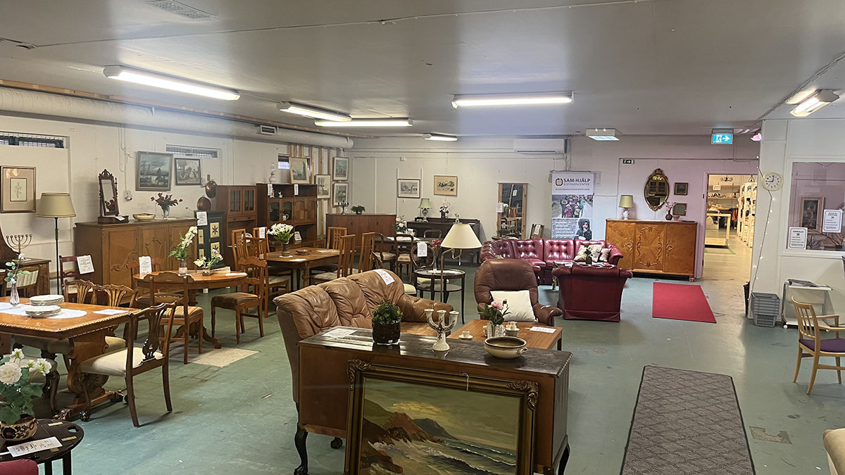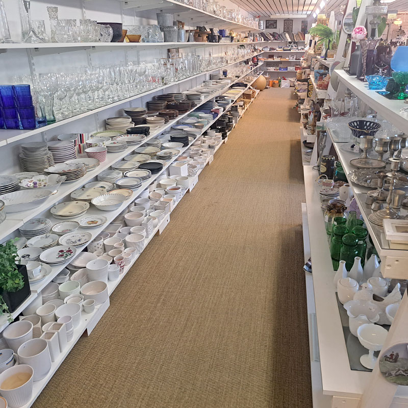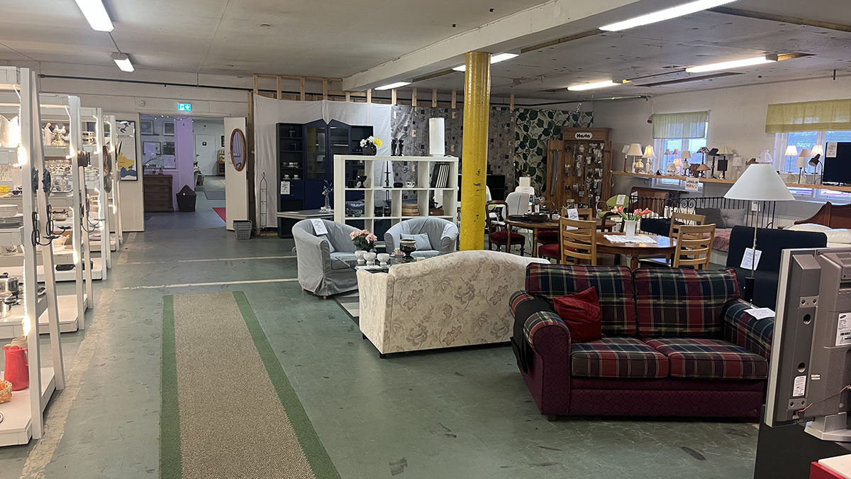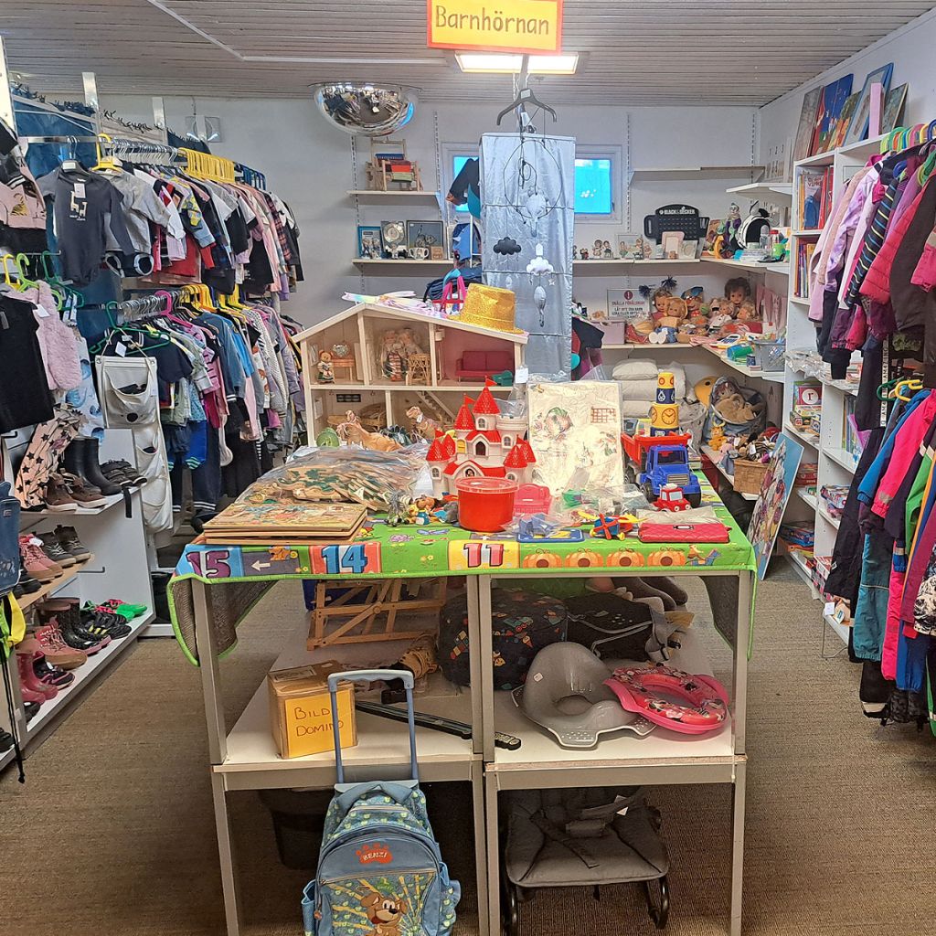 Butikslokalen är 800m² stor. Här hittar du bland annat: kläder, porslin, husgeråd, barnkläder, leksaker, lampor.
