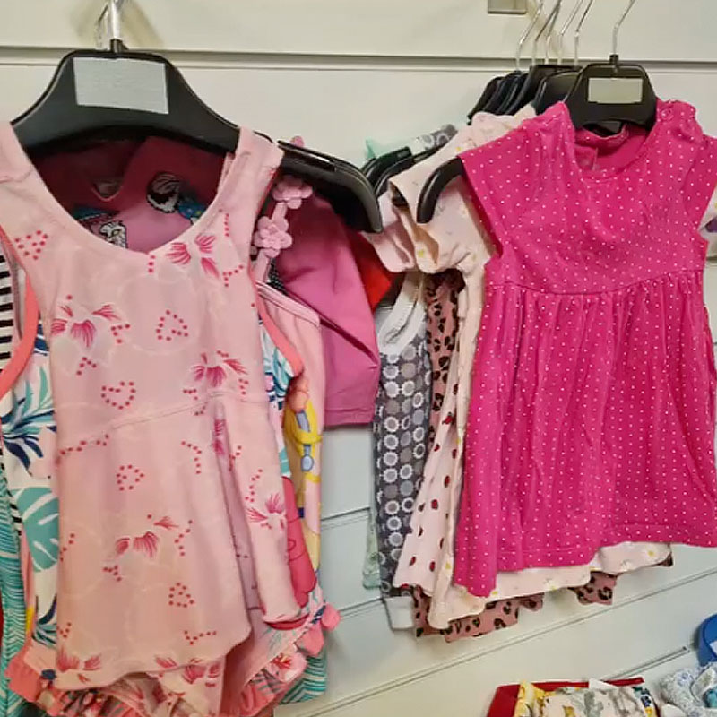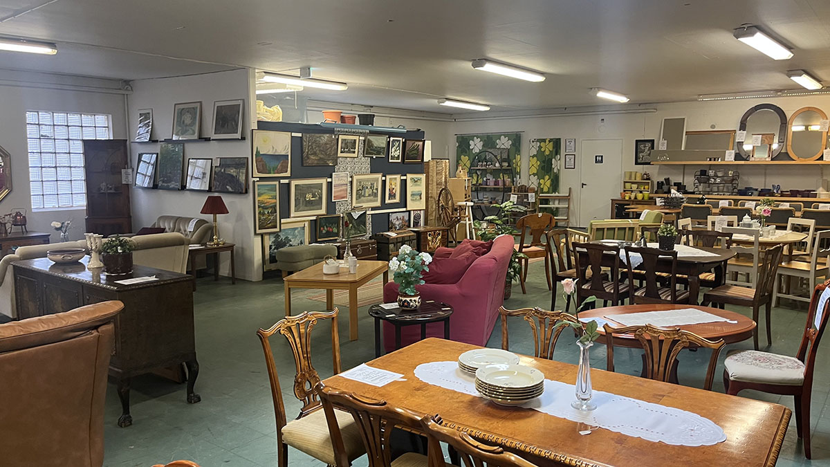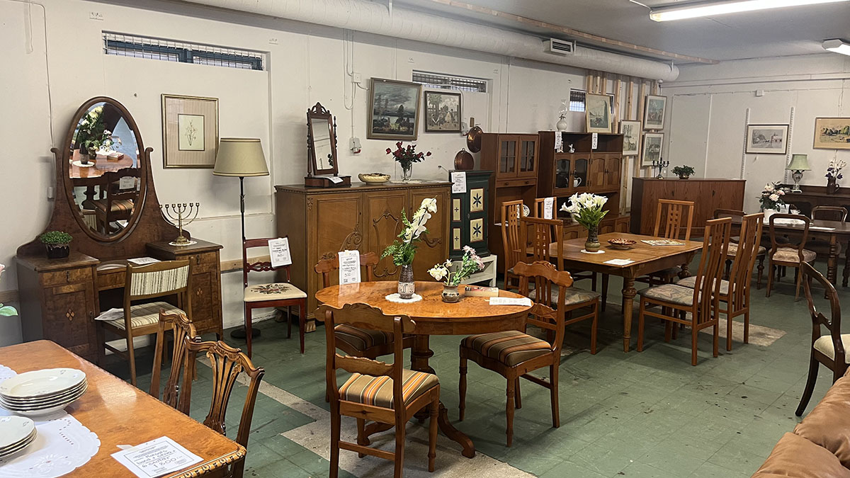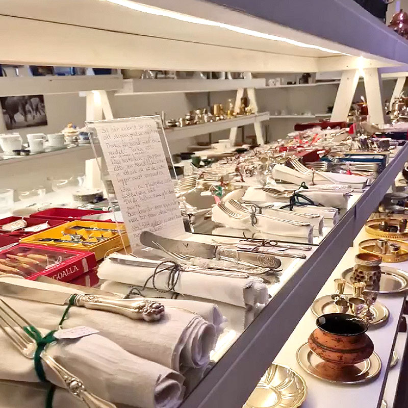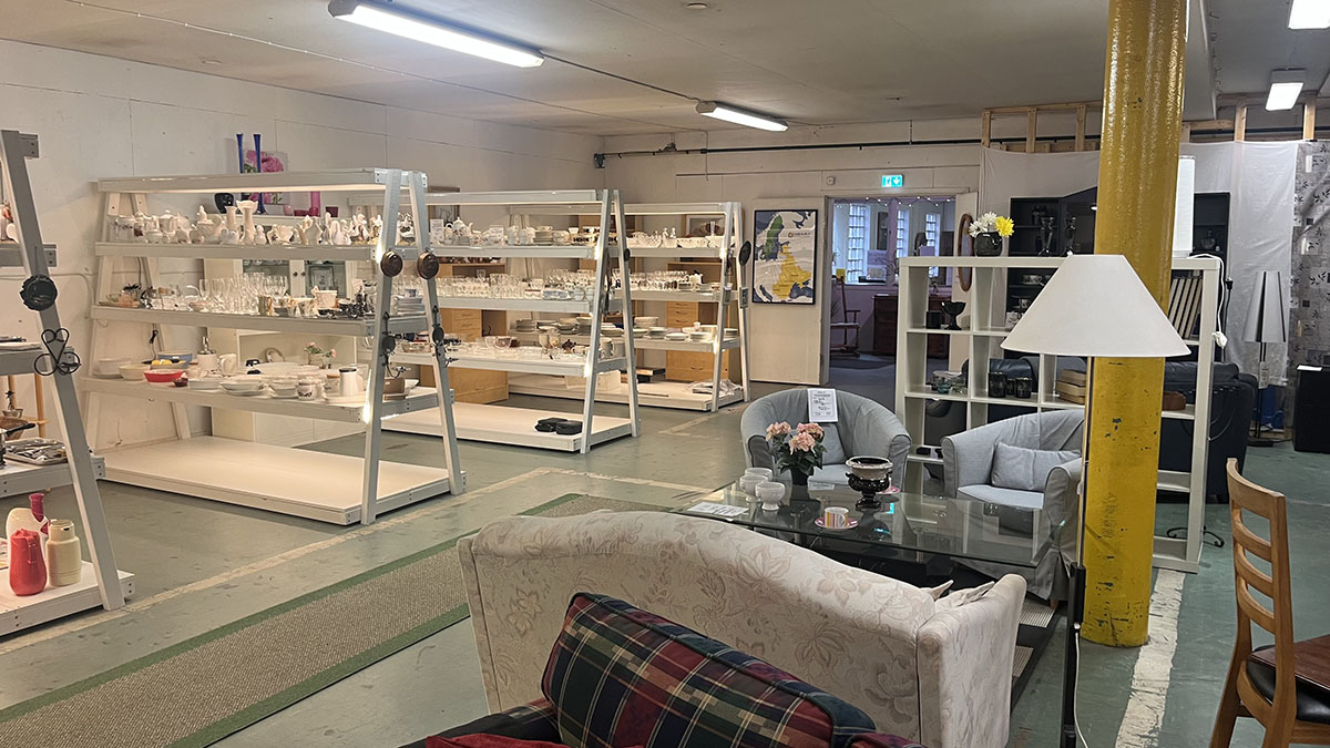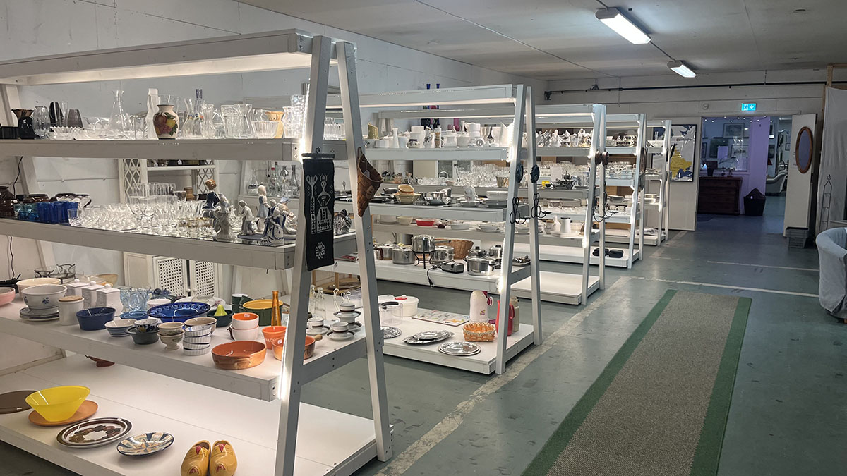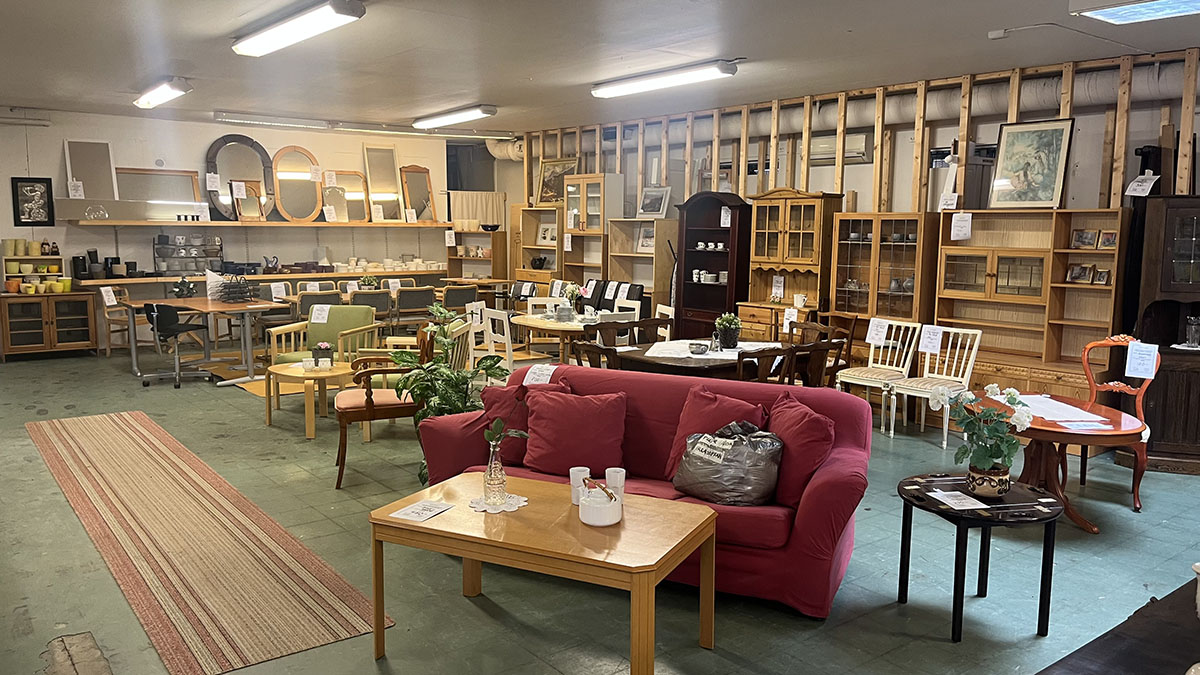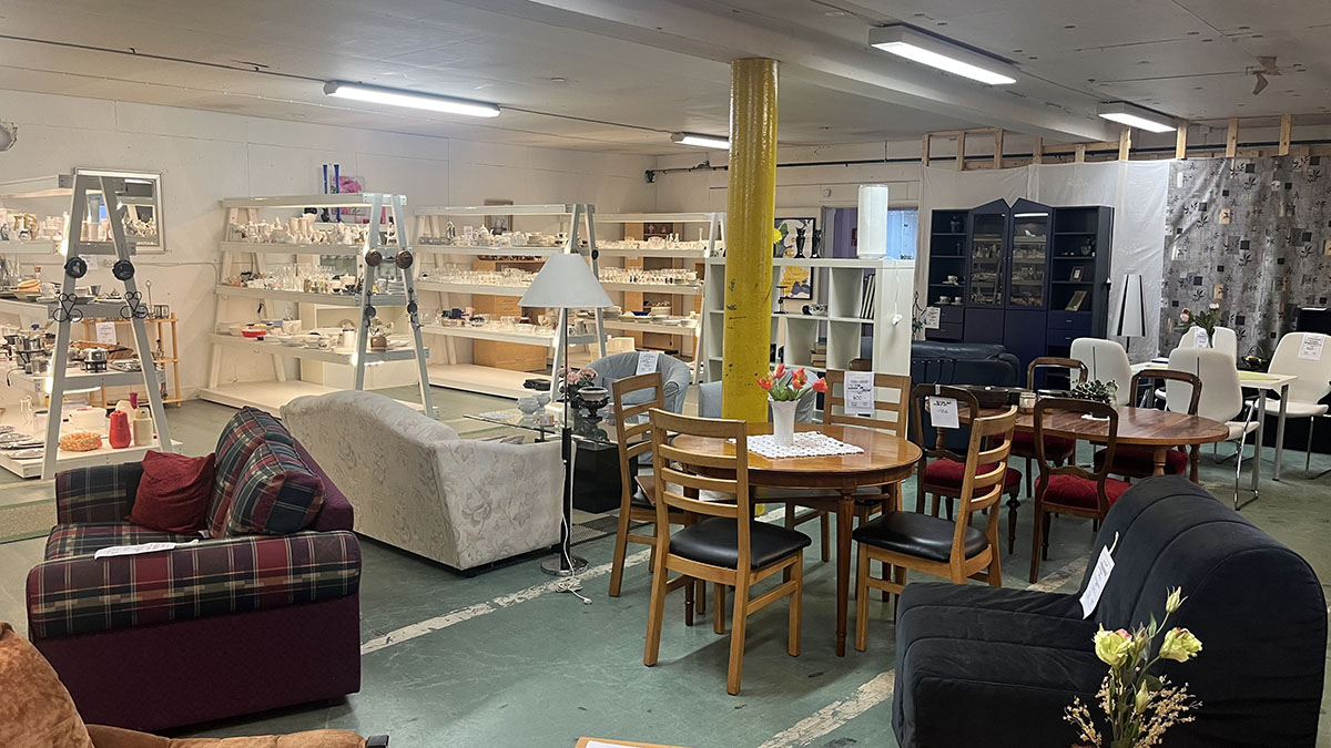 Butikslokalen är 800m² stor. Här hittar du bland annat: kläder, porslin, husgeråd, barnkläder, leksaker, lampor.